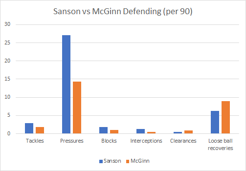 Defensively, Sanson is more active than McGinn, recording nearly double the number of pressures as well as totting up more tackles, blocks and interceptions. Sanson also has the edge when it comes to aerial duels, winning 40.9% of his battles compared to 25.7% for McGinn. McGinn beats Sanson in some areas, such as clearances, loose ball recoveries, times dribbled past (1.31 per 90 compared to 2.61 for Sanson) and fouls committed (1 per 90 compared to 1.96). It’s difficult to say which of the two players is the better defender, but Sanson is busier, which counts for a lot.