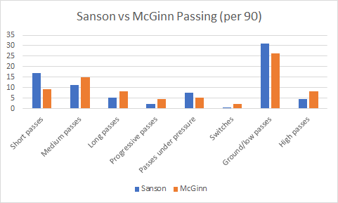 The first thing to note is that Sanson and McGinn are completely different in the way they pass the ball. As you can see from the table, Sanson plays more short and low passes, whereas McGinn plays more medium, long and high passes, as well as more progressive passes and more switches. Despite playing more difficult passes, McGinn actually has a higher completion percentage overall (77.1% compared to 75.7%) which would indicate that McGinn is a better passer of the ball than Sanson. However, Sanson attempts more passes whilst under pressure, which is likely to influence his accuracy.