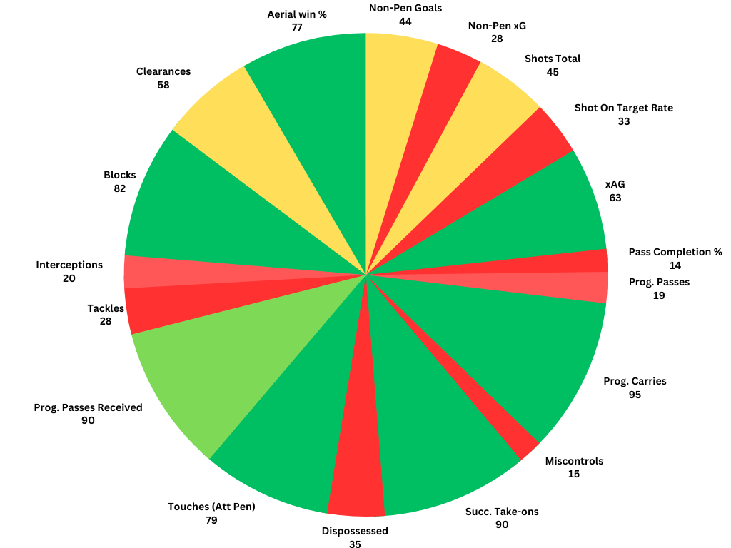 The pace Williams possesses is legit and he uses it to get behind the back four with regularity. He ranks in the 90th percentile for progressive passes received and the 79th for touches in the penalty area, indicating his effectiveness at getting in dangerous areas.