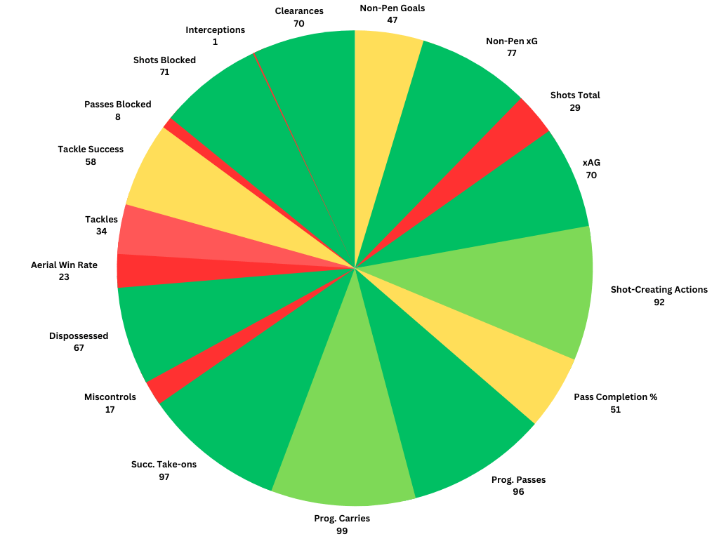 The fact his pass accuracy ranks in the 51st percentile given how many difficult passes he attempts is a testament to his quality. His composure and in-possession ability is something most centre-backs simply don’t have.
