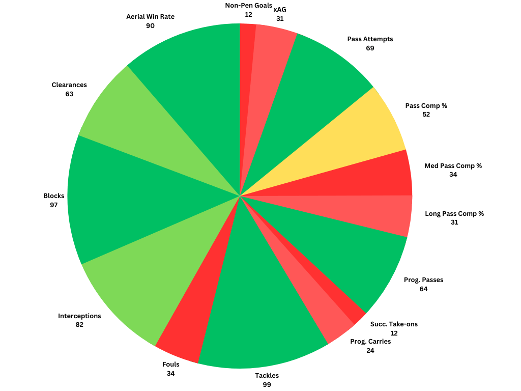 Adams ranks in the 99th percentile for total tackles, the 97th percentile for percentage of dribblers tackled, and the 82nd percentile for interceptions, compared to midfielders in the ‘Big 5’ European leagues.