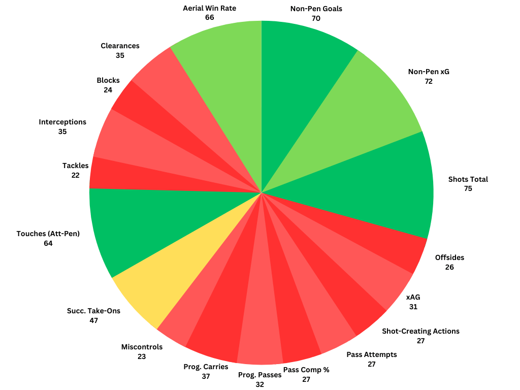 His style means he often strays offside, ranking in the 26th percentile, and like a lot of strikers if they don’t get the ball, he can be a bit petulant.