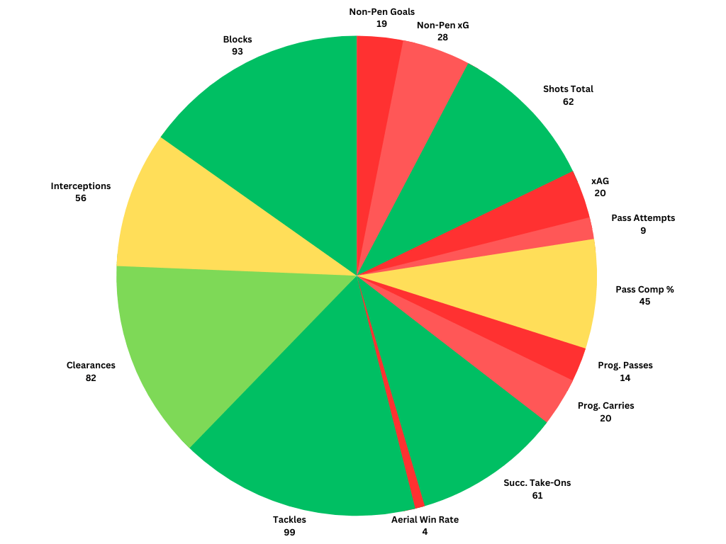 If he is going to be used as a centre-back, Bamba doesn’t quite have the ideal height at 6’0” on the nose. His spring helps but certain centre-forwards could take advantage and Bamba can struggle when headers are contested, ranking in the 4th percentile for aerial duel win rate.
