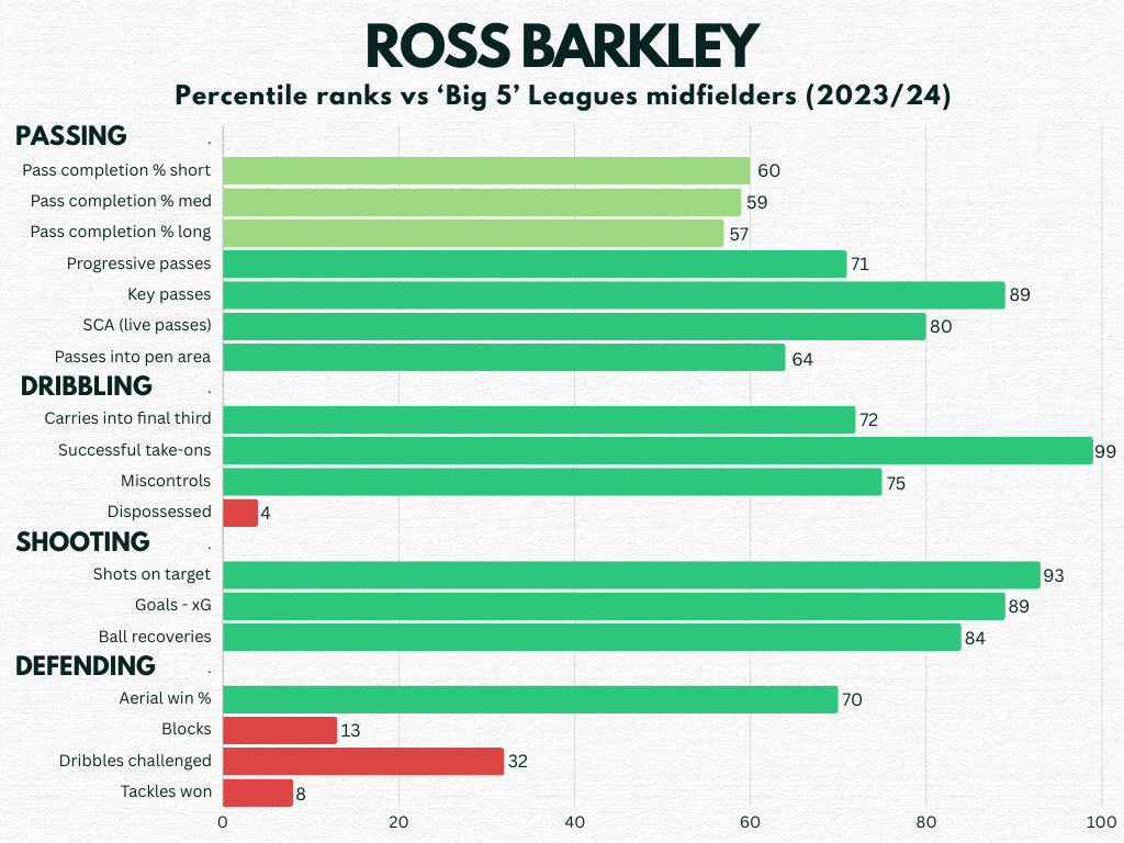 First things first, Barkley is still an excellent technical footballer. He has a clean first touch and for the 2023/24 season, ranked in the 75th percentile for miscontrols among midfielders in the ‘Big 5’ European leagues.