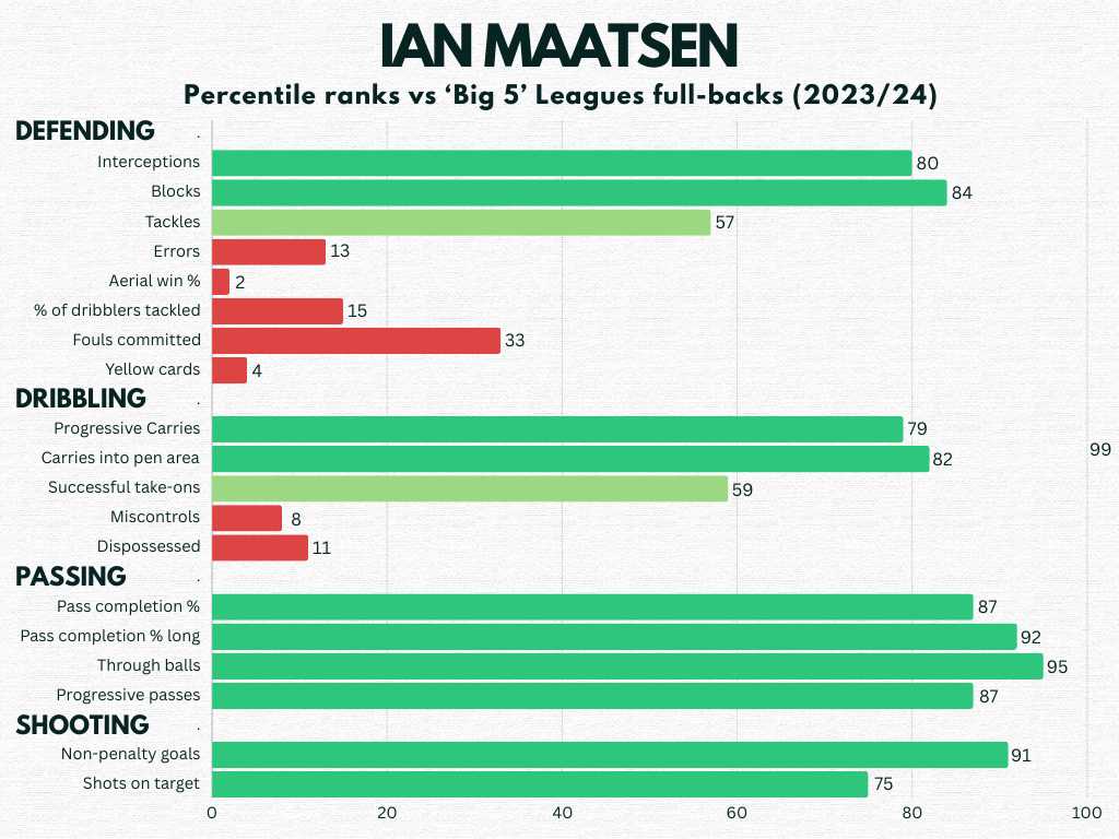 In attack, Maatsen carries the ball forward with pace, ranking in the 79th percentile for progressive carries. He stretches defences on overlaps and is suited to playing the game at pace.